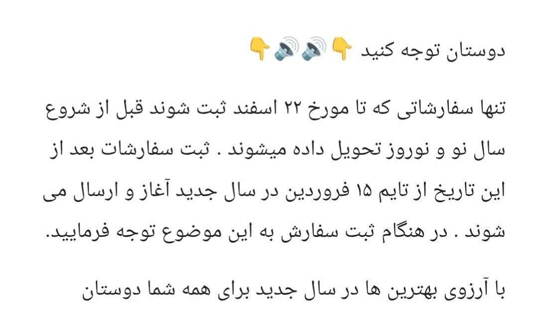 برای عملکرد بهتر و سریع تر از فیلتر شکن استفاده نکنید🚫 📌 لطفا به زمان ارسال سفارشتون دقت کنید و برای دریافت کد پیگیری ۳ روز بعد از زمان ارسال اقدام کنید با تشکر🙏