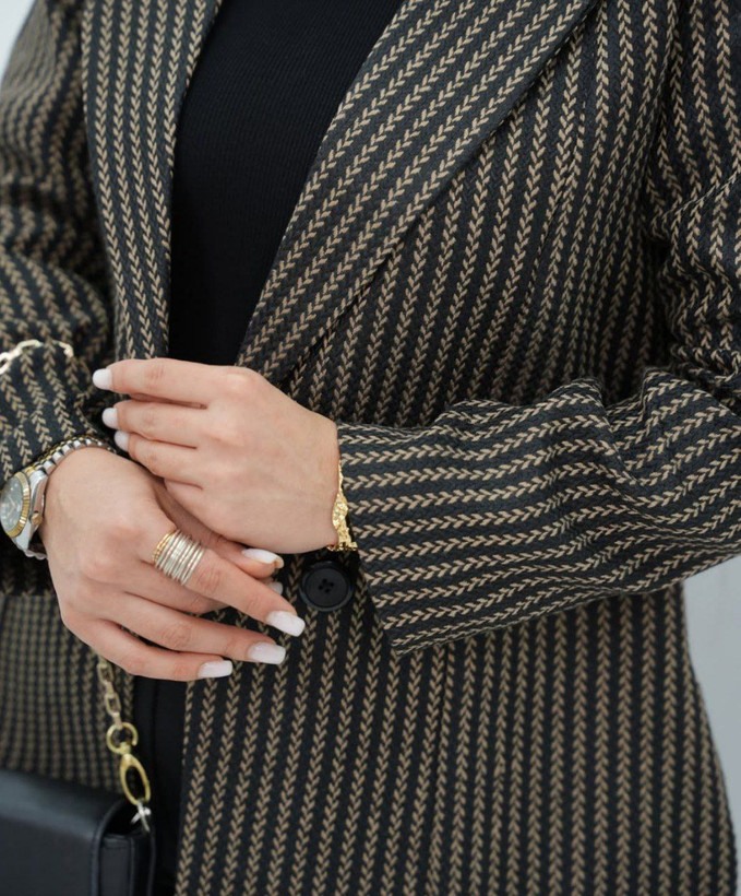 توضیحات✨قد 70 ✨قد آستین 58 ✨دور سایز یک104 ✨دور سینه سایز دو 110 👌جلو کت لایه کوبی شده ✨دکمه نما